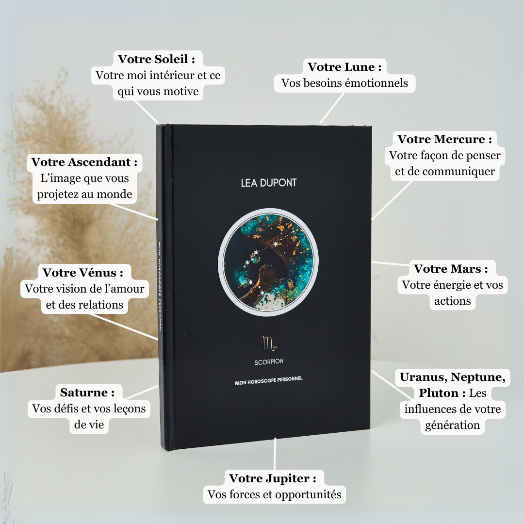 Un livre sur mesure qui interprète votre thème astral pour une compréhension plus profonde de vous-même et de votre vie.